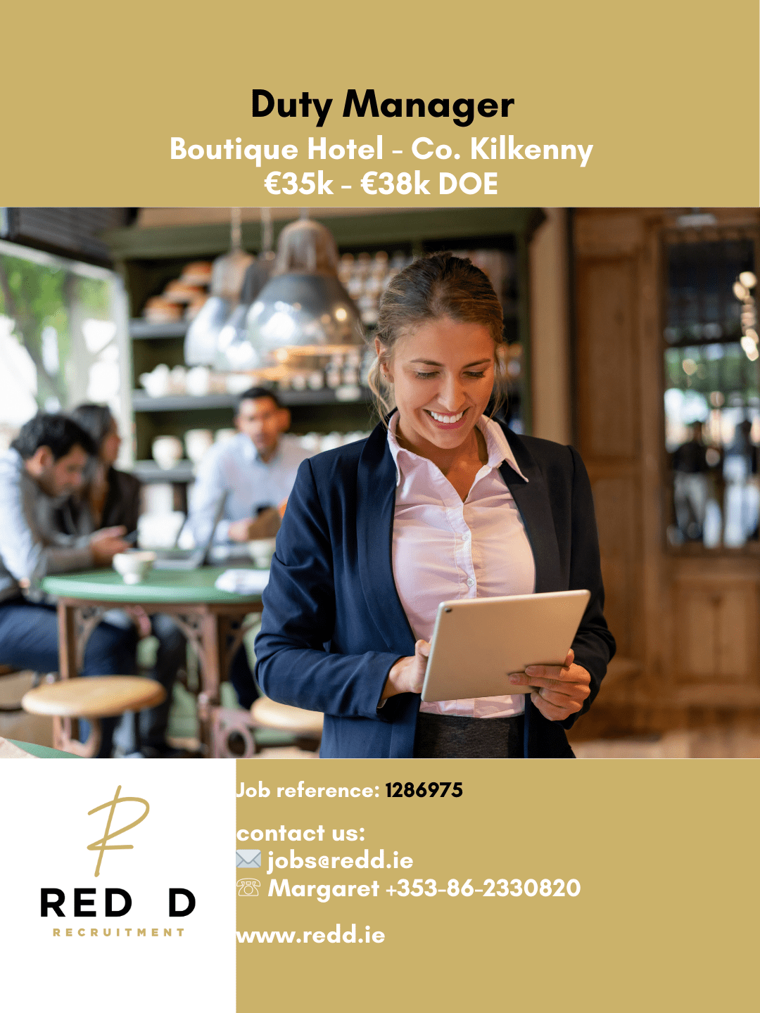 Duty Manager – Boutique Hotel, Co. Kilkenny Red D are recruiting a Duty Manager for a beautiful boutique hotel in Co. Kilkenny. This is a superb opportunity for an...